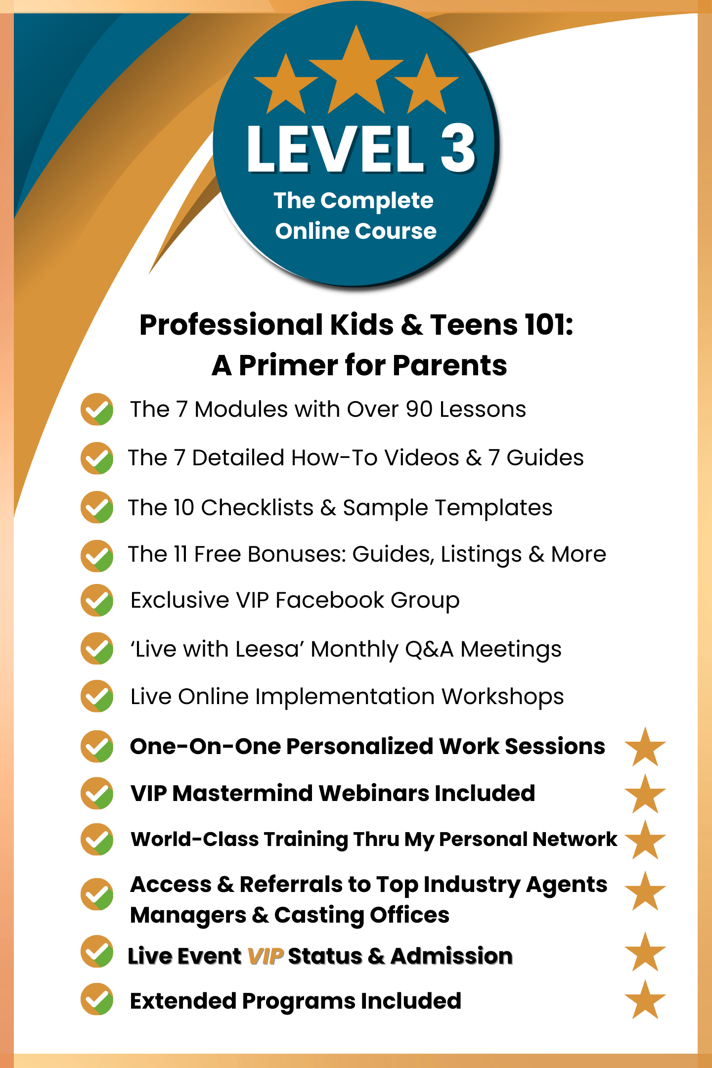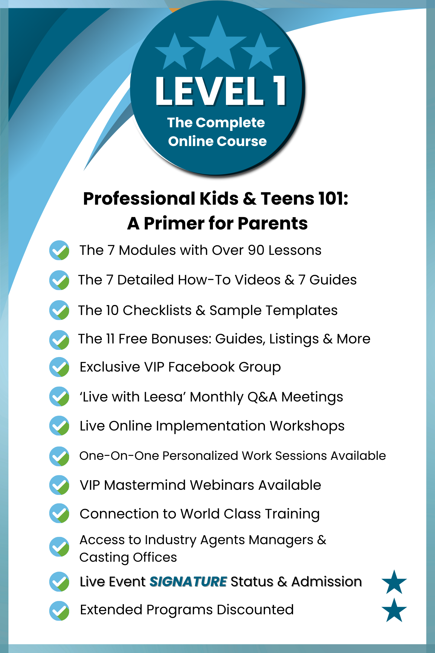...to provide you with all the information, tools, guidance, best practices and timelines, video tutorials, worksheets as well as networks for training and submissions necessary to execute and create the assets needed to obtain professional representation, submit directly for work opportunities, and professionally navigate the performance industry with your child or teen. If you are not fully satisfied based on our promise, we will refund the full price of the course. This applies within 30-days of purchase.